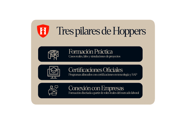 Hoppers es una entidad educativa tecnológica centrada en formación orientada al empleo, con foco en habilidades y certificaciones que tienen salida laboral real. Nuestros itinerarios combinan rigor académico, práctica intensiva y proyectos reales para que lo que aprendes en clase se parezca a lo que vivirás en un equipo de IT, consultoría o negocio.